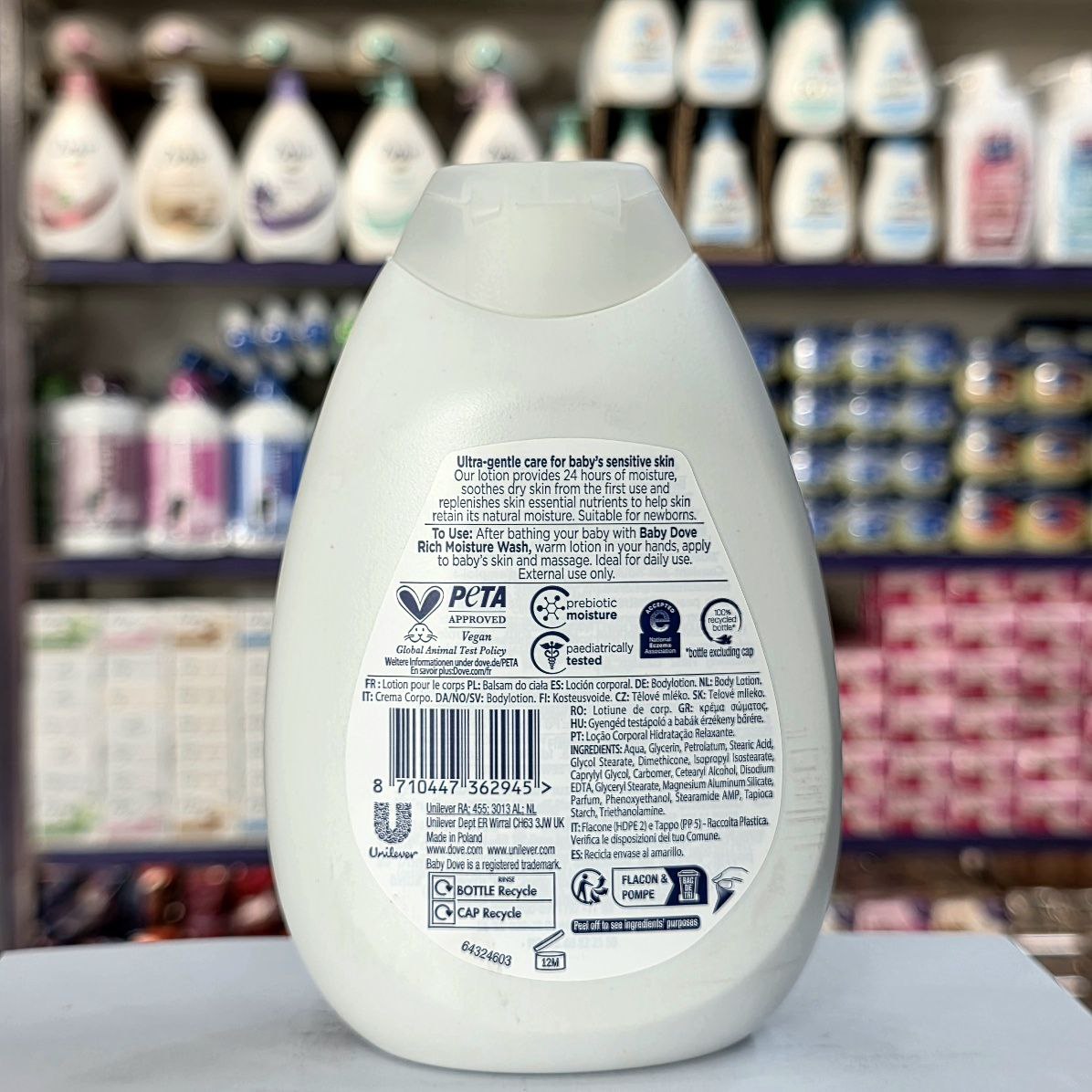 روش مصرف: پس از استحمام با شوینده Baby Dove، مقدار مناسبی از لوسیون را روی پوست کودک ماساژ دهید. مناسب استفاده روزانه.